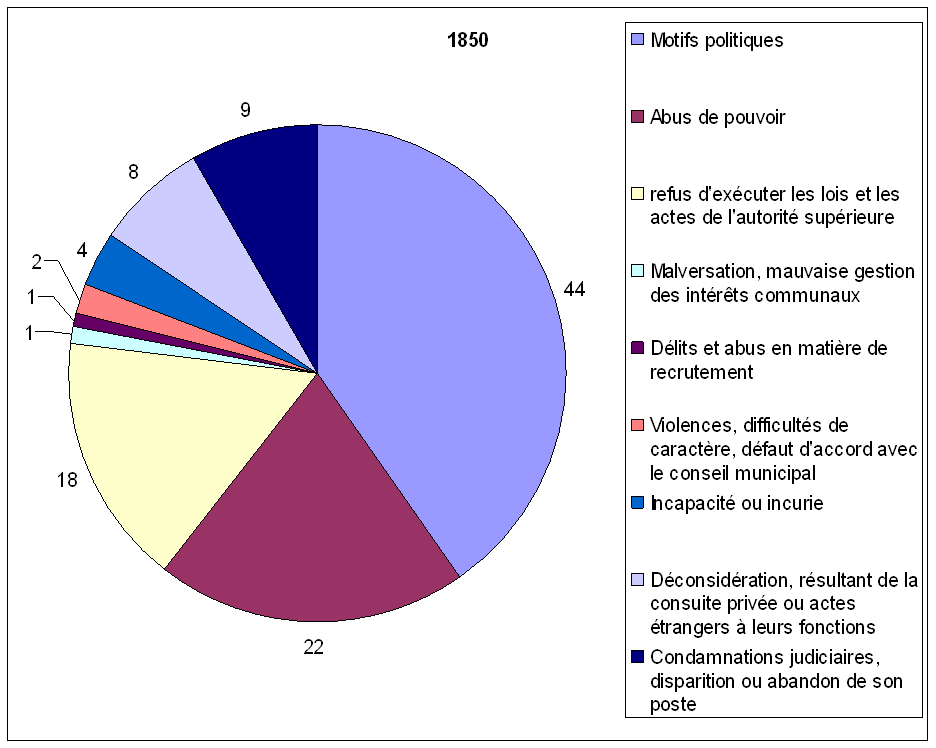 Aussi souvent que reviennent tout au long du XIXe siècle les remplacements autoritaires de maires dus aux circonstances politiques, ils ne doivent pas nous dissimuler le fait que les motifs purement administratifs de révocation ont été plus que fréquents et nombreux.